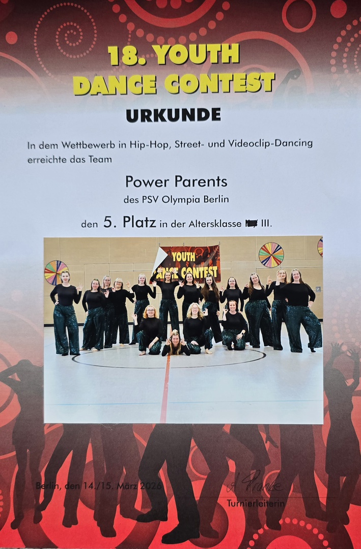 Auch die "Power Parents" hatten den Mut bei diesem stark besetzten Wettkampf anzutreten. Mit bester Laune starteten sie gegen die viel jüngeren Hip Hop - Mannschaften und boten eine tolle tänzerische Leistung, die mit dem 5. Platz belohnt wurde. Die Freude darüber war sehr groß und natürlich werden sie auch im nächsten Jahr wieder dabei sein.